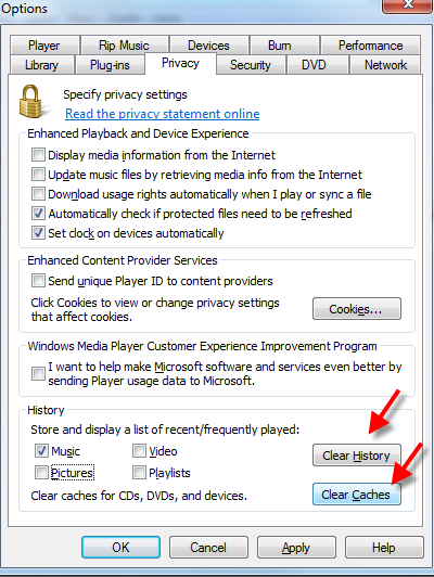 • Click the “Clear History” button located to the right of this area. It will immediately clear your media playing history from Windows Media Player. To further get rid of more media information, press the “Clear Caches” button to delete the caches of your CDs or other devices. Press the “OK” button to close the “Options” dialogue box and finish the recent changes you’ve made to Windows Media Player.